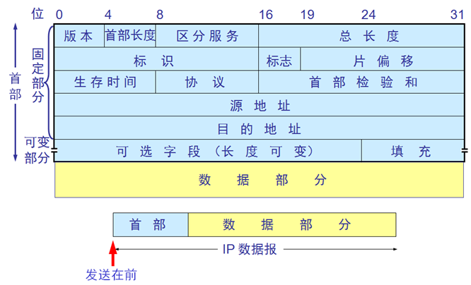 IP报文由首部和数据两部分组成。首部又由固定部分和可选字段组成,其中固定部分的长度为20字节。关于首部各字段的定义如下: