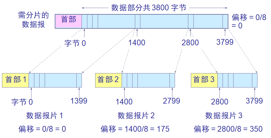 三个分片分别长度为1420、1420、1020,数据部分长度分别为1400、1400、1000 偏移量单位为8个字节一组,则偏移量分别为0、175、350 MF为1、1、0 DF为0、0、0