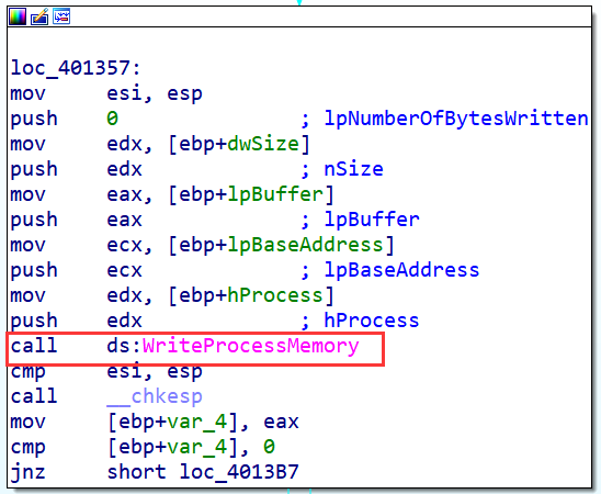 BOOL WriteProcessMemory( HANDLE hProcess, LPVOID lpBaseAddress, LPCVOID lpBuffer, SIZE_T nSize, SIZE_T *lpNumberOfBytesWritten );