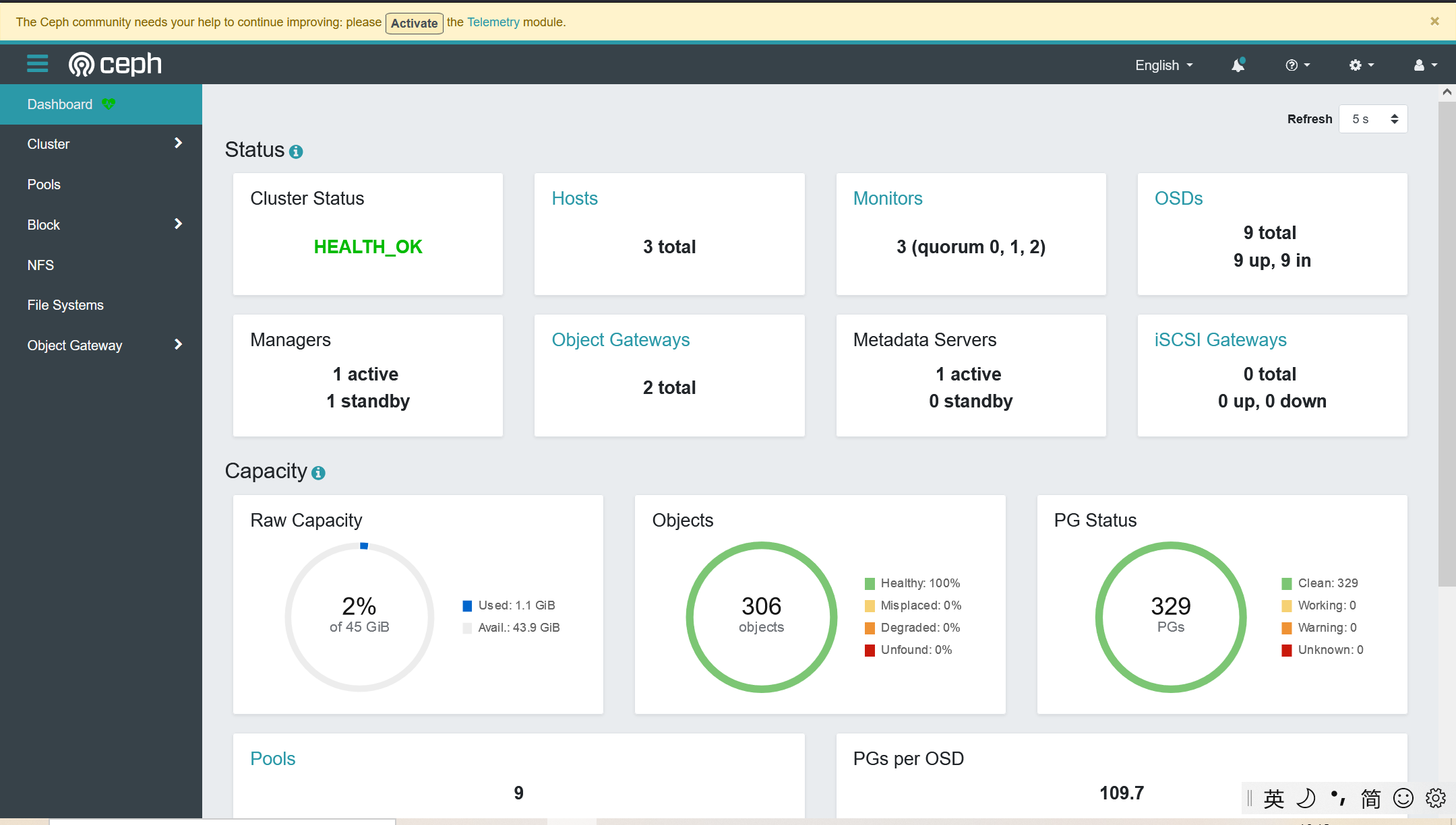 usage: 1.1 GiB used, 44 GiB / 45 GiB avail