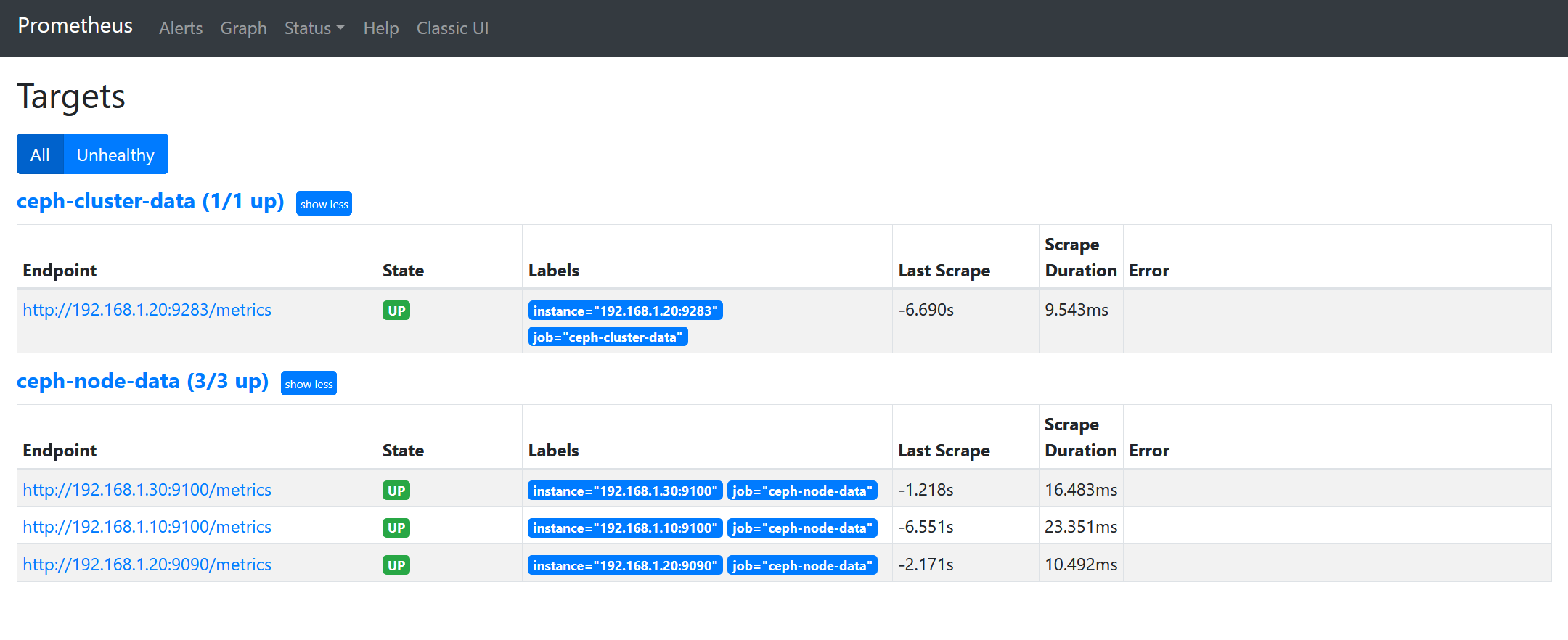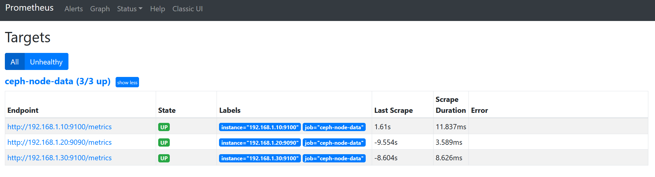 1 root@ceph-node2:/apps# vim /apps/prometheus/prometheus.yml 2 scrape_configs: 3 # The job name is added as a label `job=<job_name>` to any timeseries scraped from this config. 4 - job_name: 'ceph-node-data' 5 6 # metrics_path defaults to '/metrics' 7 # scheme defaults to 'http'. 8 9 static_configs: 10 - targets: ['192.168.1.10:9100','192.168.1.20:9090','192.168.1.30:9100'] 11 root@ceph-node2:/apps# systemctl restart prometheus.service