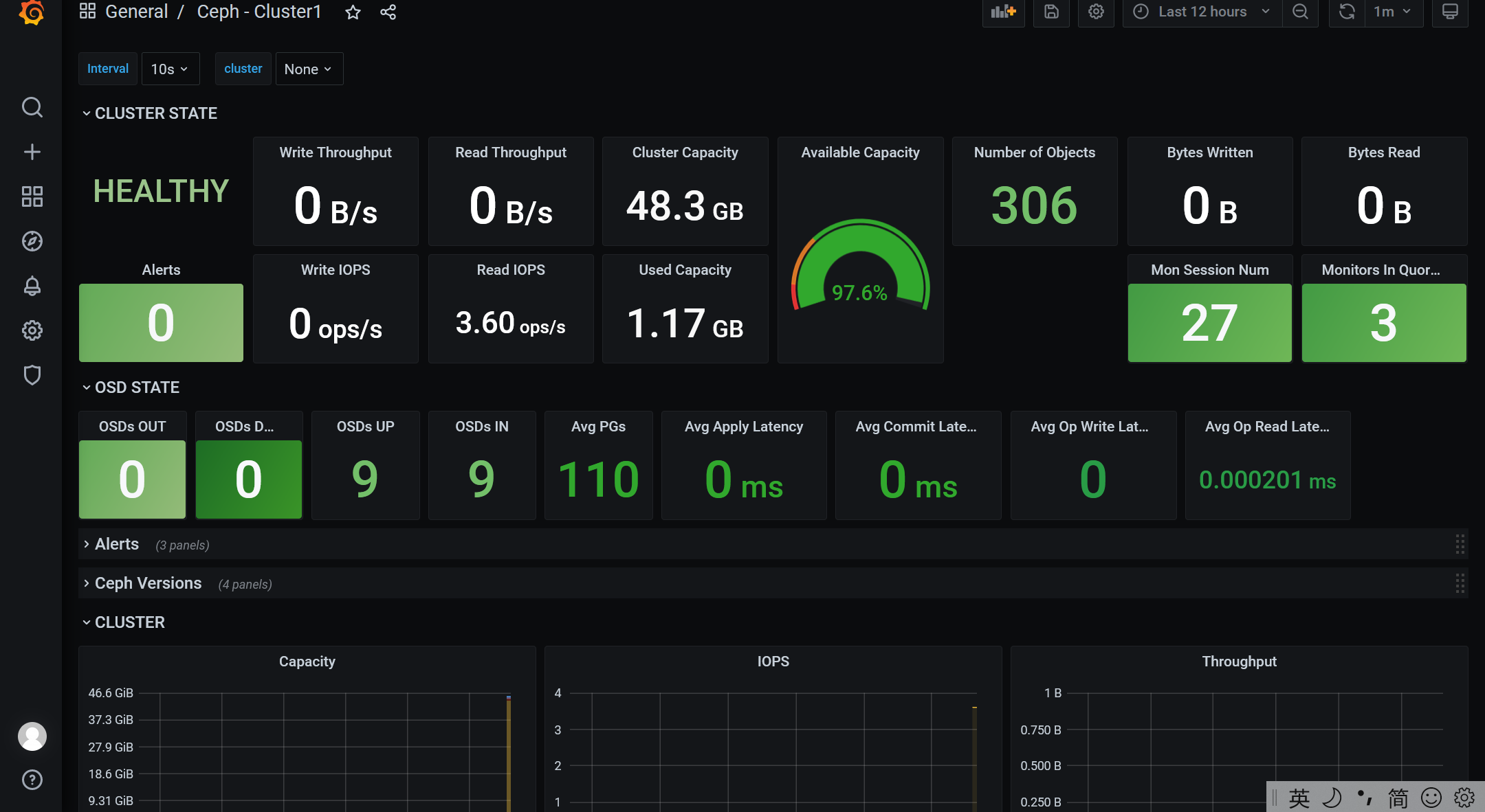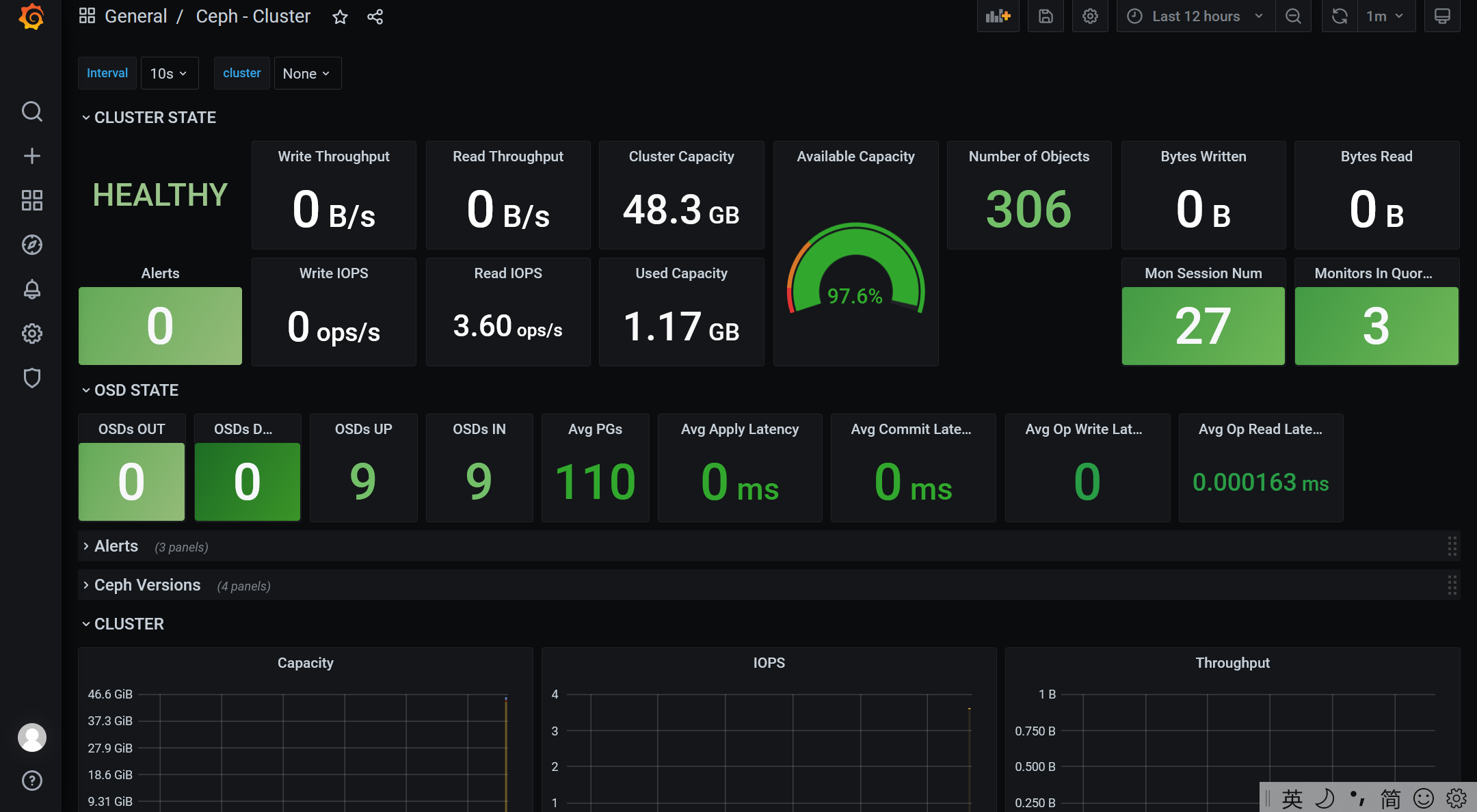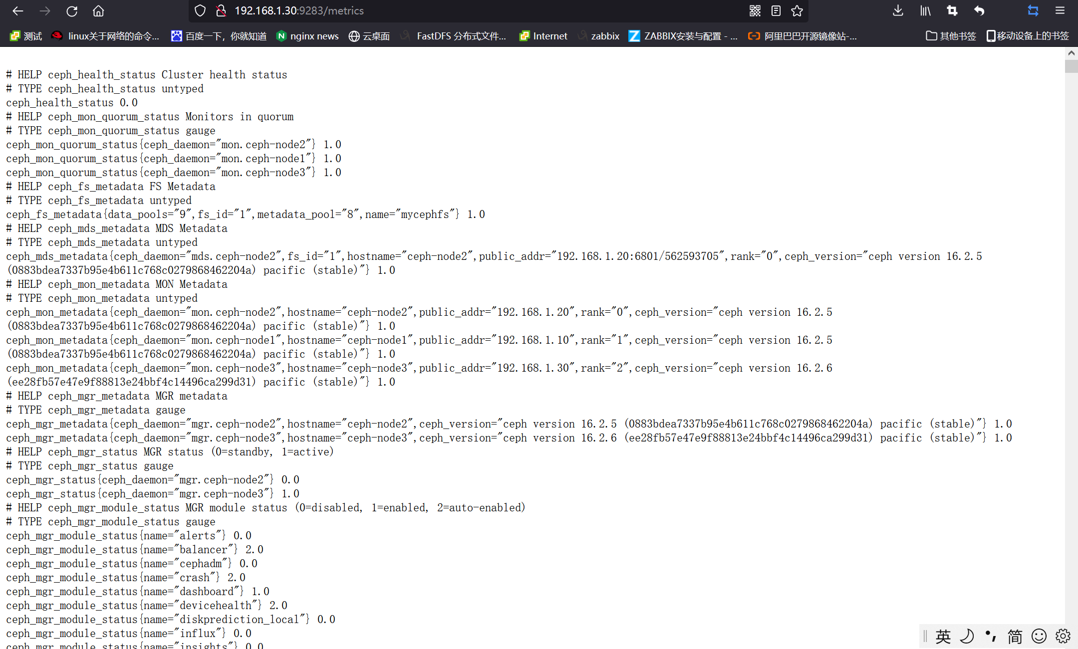 1 Ceph manager 内部的模块中包含了 prometheus 的监控模块,并监听在每个 manager 节点的 9283 端口,该端口用于将采集到的信息通过 http 接口向 prometheus 提供数据。 2 3 https://docs.ceph.com/en/mimic/mgr/prometheus/?highlight=prometheus 4 5 root@ceph-node2:/apps# ceph mgr module enable prometheus 6 root@ceph-node2:/apps# ss -tnl | grep 9283 7 LISTEN 0 5 *:9283