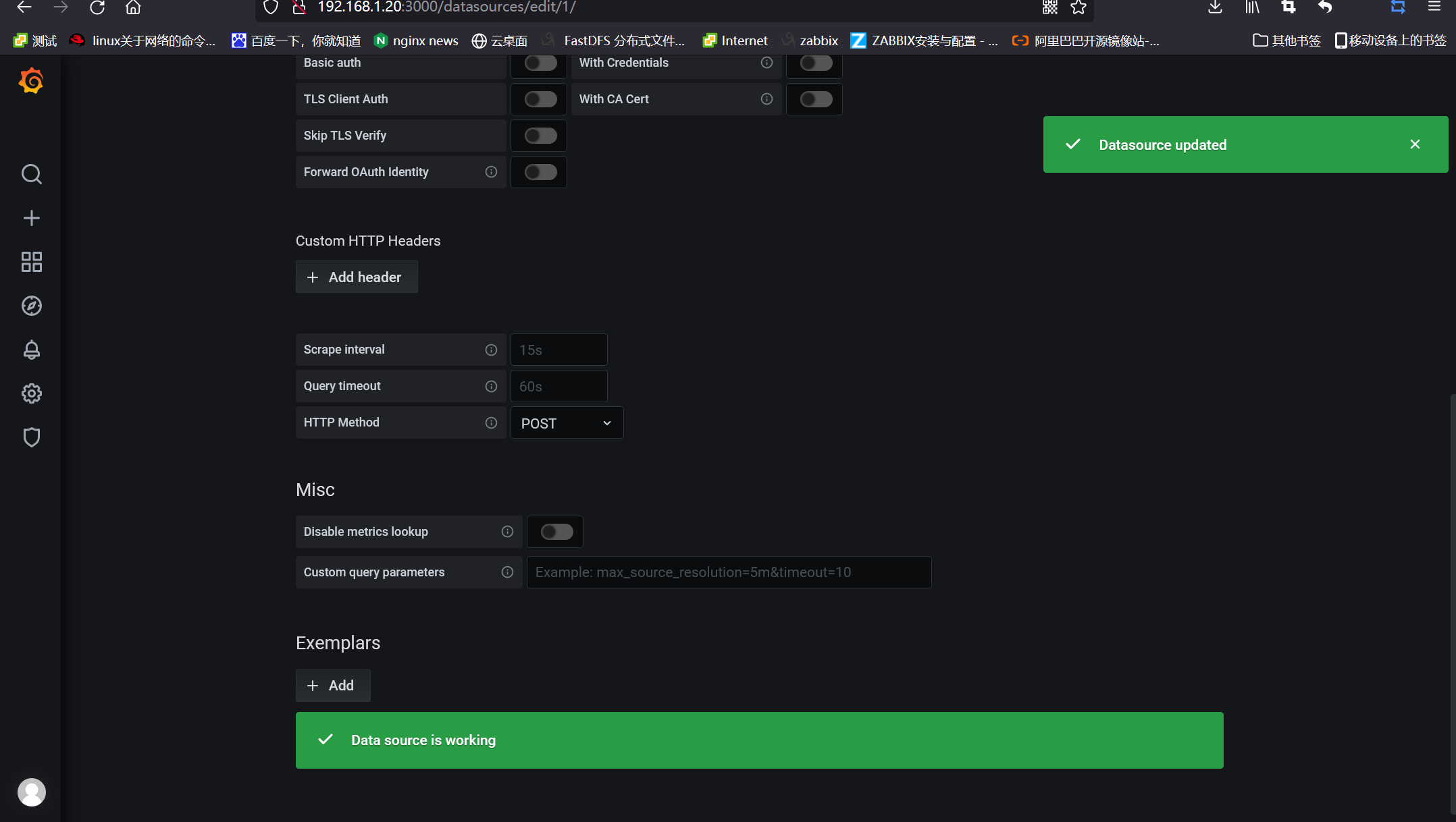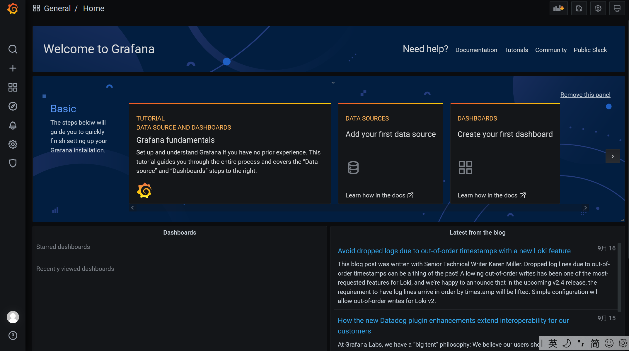 1 root@ceph-node2:/apps# apt-get install -y adduser libfontconfig1 2 Reading package lists... Done 3 Building dependency tree 4 Reading state information... Done 5 adduser is already the newest version (3.116ubuntu1). 6 libfontconfig1 is already the newest version (2.12.6-0ubuntu2). 7 libfontconfig1 set to manually installed. 8 0 upgraded, 0 newly installed, 0 to remove and 162 not upgraded. 9 10 root@ceph-node2:/apps# wget https://dl.grafana.com/oss/release/grafana_7.5.1_amd64.deb 11 --2021-09-20 11:19:48-- https://dl.grafana.com/oss/release/grafana_7.5.1_amd64.deb 12 Resolving dl.grafana.com (dl.grafana.com)... 151.101.54.217, 2a04:4e42:d::729 13 Connecting to dl.grafana.com (dl.grafana.com)|151.101.54.217|:443... connected. 14 HTTP request sent, awaiting response... 200 OK 15 Length: 55597840 (53M) [application/vnd.debian.binary-package] 16 Saving to: ‘grafana_7.5.1_amd64.deb’ 17 18 grafana_7.5.1_amd64.deb 100%[================================================================>] 53.02M 2.86MB/s in 20s 19 20 2021-09-20 11:20:10 (2.61 MB/s) - ‘grafana_7.5.1_amd64.deb’ saved [55597840/55597840] 21 22 root@ceph-node2:/apps# dpkg -i grafana_7.5.9_amd64.deb 23 dpkg: error: cannot access archive 'grafana_7.5.9_amd64.deb': No such file or directory 24 root@ceph-node2:/apps# ls 25 1 node_exporter prometheus-2.23.0.linux-amd64 26 alertmanager-0.21.0.linux-amd64.tar.gz node_exporter-1.0.1.linux-amd64 prometheus-2.23.0.linux-amd64.tar.gz 27 grafana-7.3.6-1.x86_64.rpm node_exporter-1.0.1.linux-amd64.tar.gz 28 grafana_7.5.1_amd64.deb prometheus 29 root@ceph-node2:/apps# dpkg -i grafana_7.5.1_amd64.deb 30 Selecting previously unselected package grafana. 31 (Reading database ... 83133 files and directories currently installed.) 32 Preparing to unpack grafana_7.5.1_amd64.deb ... 33 Unpacking grafana (7.5.1) ... 34 Setting up grafana (7.5.1) ... 35 Adding system user `grafana' (UID 117) ... 36 Adding new user `grafana' (UID 117) with group `grafana' ... 37 Not creating home directory `/usr/share/grafana'. 38 ### NOT starting on installation, please execute the following statements to configure grafana to start automatically using systemd 39 sudo /bin/systemctl daemon-reload 40 sudo /bin/systemctl enable grafana-server 41 ### You can start grafana-server by executing 42 sudo /bin/systemctl start grafana-server 43 Processing triggers for ureadahead (0.100.0-21) ... 44 Processing triggers for systemd (237-3ubuntu10.42) ... 45 root@ceph-node2:/apps# systemctl start grafana-server 46 root@ceph-node2:/apps# systemctl enable grafana-server 47 Synchronizing state of grafana-server.service with SysV service script with /lib/systemd/systemd-sysv-install. 48 Executing: /lib/systemd/systemd-sysv-install enable grafana-server 49 Created symlink /etc/systemd/system/multi-user.target.wants/grafana-server.service → /usr/lib/systemd/system/grafana-server.service. 50 root@ceph-node2:/apps# ss -tnl | grep 3000 51 LISTEN 0 128 *:3000 *:*