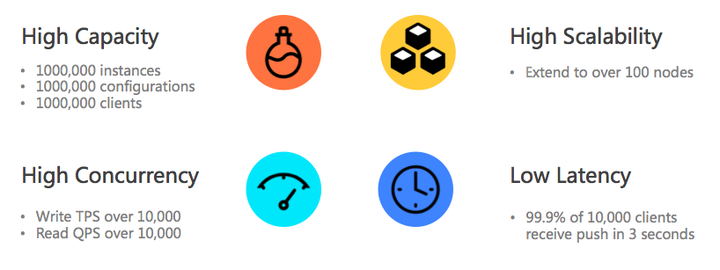 在对容量的评估时,不仅要针对企业现有的服务规模进行评估,也要对未来3到5年的扩展规模进行预测。阿里巴巴的中间件在内部支撑着集团百万级别服务实例,在容量上遇到的挑战可以说不会小于任何互联网公司。这个容量不仅仅意味着整体注册的实例数,也同时包含单个服务的实例数、整体的订阅者的数目以及查询的QPS等。Nacos在内部淘汰Zookeeper和Eureka的过程中,容量是一个非常重要的因素。