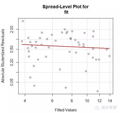 ncvTest()函数生成一个计分检验,零假设为误差方差不变,备择假设为误差方差随着拟合值水平的变化而变化。若检验显著,则说明存在异方差性(误差方差不恒定)。spreadLevelPlot()函数创建一个添加了最佳拟合曲线的散点图,展示标准化残差绝对值与拟合值的关系