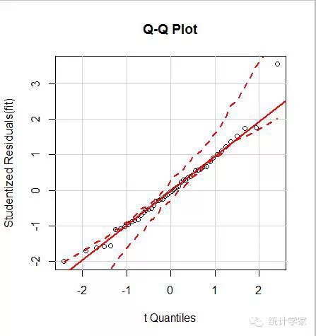 与基础包中的plot ( )函数相比,qqPlot()函数提供了更为精确的正态假设检验方法,它画出了在n-p-1个自由度的t分布下的学生化残差(( studentized residual,也称学生化删除残差或折叠化残差)图形,其中n是样本大小,p是回归参数的数目(包括截距项)。