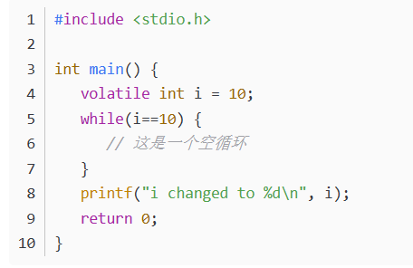 在这个例子中,我们将变量i声明为volatile。如果没有volatile关键字,编译器可能会认为在循环中i的值不会改变,并优化掉对i的检查,导致无限循环。但由于我们使用了volatile关键字,编译器会正确地生成代码来检查i的值。