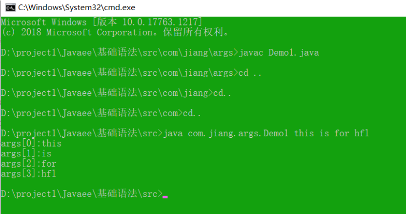 4.输入java com.jiang.args.Demo1 this is for hfl,
