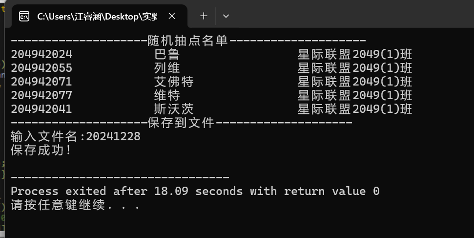 #include <stdio.h> #include<stdlib.h> #include<time.h> #include<string.h> #define N 80 typedef struct { char num[20]; char name[20]; char room[40]; }STU; STU st[N]; void read(); void func(); int main() { read(); func(); return 0; } void read() { FILE* fin; fin = fopen("list.txt", "r"); if (!fin) { printf("fail to open the file to read\n"); return; } int number; int i = 0; while (!feof(fin)) { number = fscanf(fin, "%s%s%s", st[i].num, st[i].name, st[i].room); if (number != 3) { break; } i++; } } void func() { srand(time(NULL)); int cnt[5] = { 0 }; int sign = 1; for (int i = 0; i < 5;) { int t = rand() % 80; for (int j = 0; j < 5;j++) { if (cnt[j] == t) { sign = 0; break; } } if (sign) { cnt[i] = t; i++; } } printf("--------------------随机抽点名单--------------------\n"); for (int i = 0; i < 5; i++) { printf("%-20s %-20s %-40s\n", st[cnt[i]].num, st[cnt[i]].name, st[cnt[i]].room); } printf("--------------------保存到文件--------------------\n"); printf("输入文件名:"); char filename[20]; scanf("%s", filename); strcat(filename, ".txt"); FILE* fp; fp = fopen(filename, "w"); if (!fp) { printf("fail to open the file to write\n"); return; } for (int i = 0; i < 5; i++) { fprintf(fp, "%-20s %-20s %-40s\n", st[cnt[i]].num, st[cnt[i]].name, st[cnt[i]].room); } printf("保存成功!\n"); }