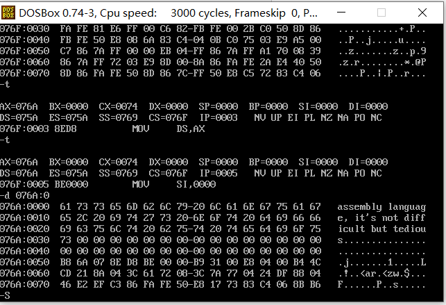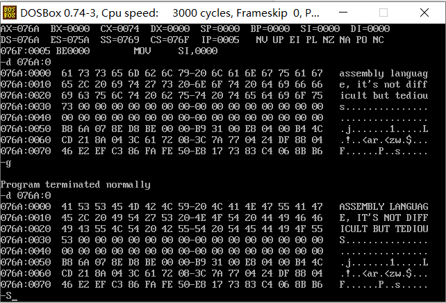 data segment str1 db "assembly language, it's not difficult but tedious" len equ $ - str1 data ends stack segment db 16 dup(0) stack ends code segment assume cs:code,ds:data,ss:stack start: mov ax,data mov ds,ax mov si,offset str1 mov cx,len call strupr mov ah,4ch int 21h strupr: s: mov al,ds:[si] cmp al,'a' jb next cmp al,'z' ja next and al,0dfh;1101 1111 mov ds:[si],al next: inc si loop s ret code ends end start