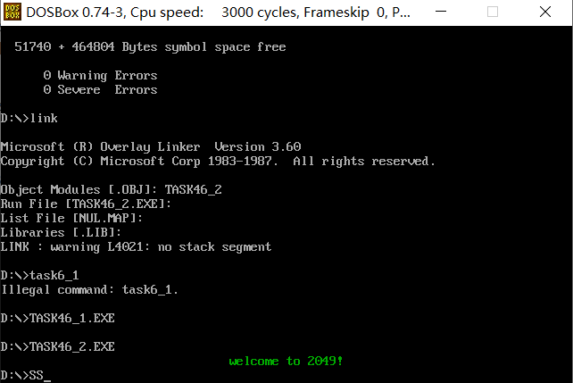 运行程序过后,通过实现中断,在屏幕底部的中间成功显示绿色的“welcome to 2049!”。在程序exe6_1.asm中,先将si赋值为标号int42的地址,将di赋值为200h,然后利用rep movsb指令,将int42到int42_end的指令复制到0:200h开始的连续内存空间,接着设置中断向量表,使得exe6_2.asm中通过int42可以跳转到中断处理程序。标号int42到int42_end的指令则实现了在屏幕第0页的最后一行中间打印绿色的“welcome to 2049!”