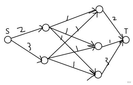 其中 \(s\) 为源点,\(t\) 为汇点,边上的数字为容量。