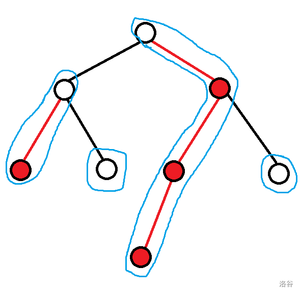 下图中,红色的点表示重儿子,红色的边表示重边,用蓝笔圈出表示重链: