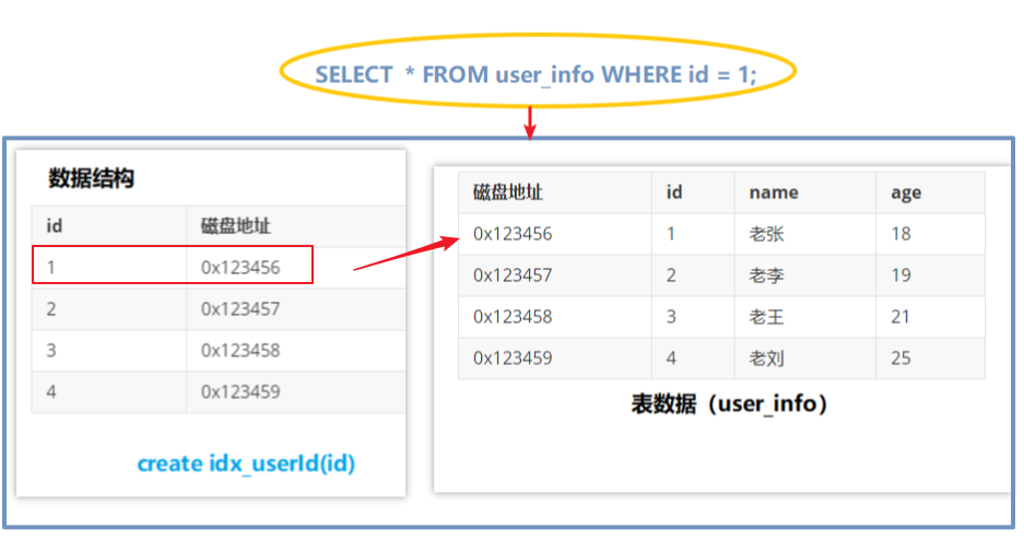 可以看到,我对ID创建了一个索引,形成了数据结构,当我要搜索ID的时候会调用我们的ID索引,直接在数据结构中扫描,找到ID对应的磁盘地址,然后快速定位,返回数据。