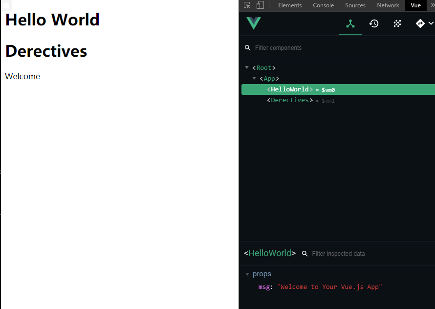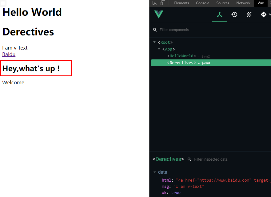 在Derectives.vue中加入一个span标签,并加入v-text属性。
