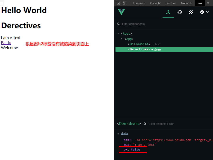 我这里将v-show 设置为true了,所以可以看到h2标签被成功渲染