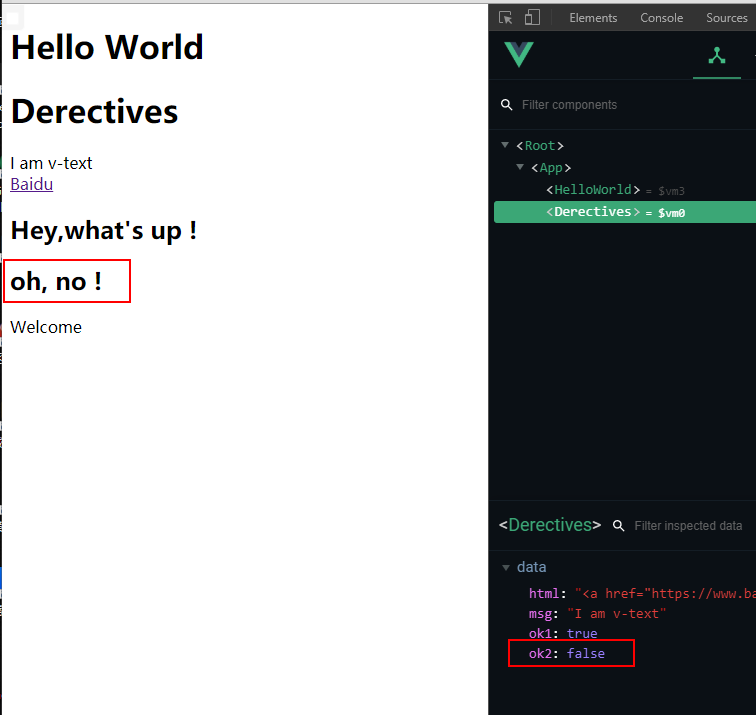 我这里的v-if="ok2",并且设置为false,所以Vue is awesome!这行没有渲染,而是oh, no!被渲染到页面。