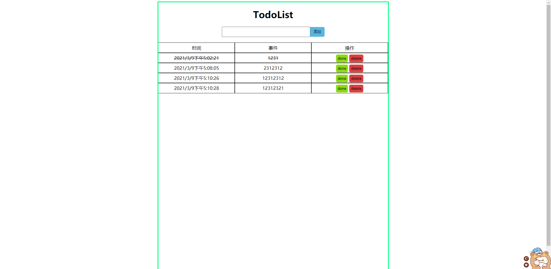 <!DOCTYPE html> <html lang="en"> <head> <meta charset="UTF-8"> <meta http-equiv="X-UA-Compatible" content="IE=edge"> <meta name="viewport" content="width=device-width, initial-scale=1.0"> <title>Document</title> </head> <style> #root { width: 800px; height: 1000px; outline: springgreen solid; position: absolute; left: 50%; transform: translateX(-50%); } .title, .search { text-align: center; } .search input { width: 300px; height: 30px; outline: none; } .search button { width: 50px; line-height: 32px; border: none; background: rgb(90, 181, 224); border-top-right-radius: 5px; border-bottom-right-radius: 5px; } .list-header { margin-top: 20px; } .list { display: flex; width: 100%; } .list-title { width: calc(100%/3); text-align: center; outline: rgb(27, 27, 27) solid 0.5px; line-height: 35px; } .done { text-decoration: line-through; display: flex; width: 100%; } .finish, .delete { border: none; border-radius: 5px; line-height: 25px; } .finish { background: rgb(139, 218, 20); } .delete { background: rgb(219, 64, 64); margin-left: 5px; } </style> <body> <div id="root"></div> <script crossorigin src="https://unpkg.com/react@16/umd/react.development.js"></script> <script crossorigin src="https://unpkg.com/react-dom@16/umd/react-dom.development.js"></script> <!-- jsX语法 --> <script src="https://unpkg.com/babel-standalone@6/babel.min.js"></script> <script type="text/babel"> class ListItem extends React.Component{ constructor(props){ super(props) console.log(this.props) this.handelDone = this.handelDone.bind(this) } handleDel(){ this.props.handleDelete(this.props.id) } handelDone(){ this.props.handelDone(this.props.id) } render(){ return( <div className="list" className={this.props.status==1?'done':'list'}> <div className="list-title">{this.props.time}</div> <div className="list-title">{this.props.text}</div> <div className="list-title"> <button className="finish" onClick={this.handelDone}>done</button> <button className="delete" onClick={()=>{this.handleDel()}}>delete</button> </div> </div> ) } } class ListApp extends React.Component{ constructor(props){ super(props) console.log(props) } render(){ let items=this.props.items console.log(items) return( <div> { items.map((item,i)=>{ console.log(item,i) return( <ListItem key={item.id} id={item.id} text={item.text} time={item.time} status={item.status} handelDone={this.props.handelDone} handleDelete={this.props.handleDelete} /> ) }) } </div> ) } } class TodoList extends React.Component{ constructor(props){ super(props) this.state={ text:'', items:[{id: 1, status: 1, text: "去月球"},{id: 2, status: 0, text: "去火星"}] } this.add = this.add.bind(this) this.hanlChange = this.hanlChange.bind(this) this.handleDelete = this.handleDelete.bind(this) this.handelDone = this.handelDone.bind(this) let data = JSON.parse(localStorage.getItem("data")) if(data==null){ data=[] } if(data.length>0){ this.state.items=data }else{ this.state.items=[] } } //添加事件 add(e) { let obj={} obj.time=new Date().toLocaleString() obj.status=0 obj.text = this.state.text let data = this.state.items if(data==null){ data=[] } data.push(obj) data.map((item,i)=>{ item.id = i }) this.setState({ items:data }) data=JSON.stringify(data) console.log(data) localStorage.setItem("data",data) this.setState({ text:'' }) } //输入框改变事件 hanlChange(e){ this.setState({ text:e.target.value }) } // enter事件 onKeyDownchange(e){ if(e.keyCode == 13) { this.add() } } //完成 handelDone(taskid){ let items = this.state.items; items = items.filter(item => { if(item.id == taskid){ item.status=1 } return item }); this.setState({ items:items }) let data = JSON.stringify(items) localStorage.setItem("data",data) } //删除 handleDelete(taskid) { let items = this.state.items; items = items.filter(item => item.id !== taskid); this.setState({ items: items }); this.setState({ items:items }) let data = JSON.stringify(items) localStorage.setItem("data",data) } render(){ return( <div> <div className="title"> <h1>TodoList</h1> </div> <div className="search"> <input type="text" value={this.state.text} onChange={this.hanlChange} onKeyDown={e=> this.onKeyDownchange(e)}/> <button onClick={this.add}>添加</button> </div> <div className="list list-header"> <div className="list-title">时间</div> <div className="list-title">事件</div> <div className="list-title">操作</div> </div> <ListApp items={this.state.items} handleDelete={this.handleDelete} handelDone={this.handelDone}/> </div> ) } } ReactDOM.render( <TodoList />, document.getElementById('root') ); </script> </body> </html>