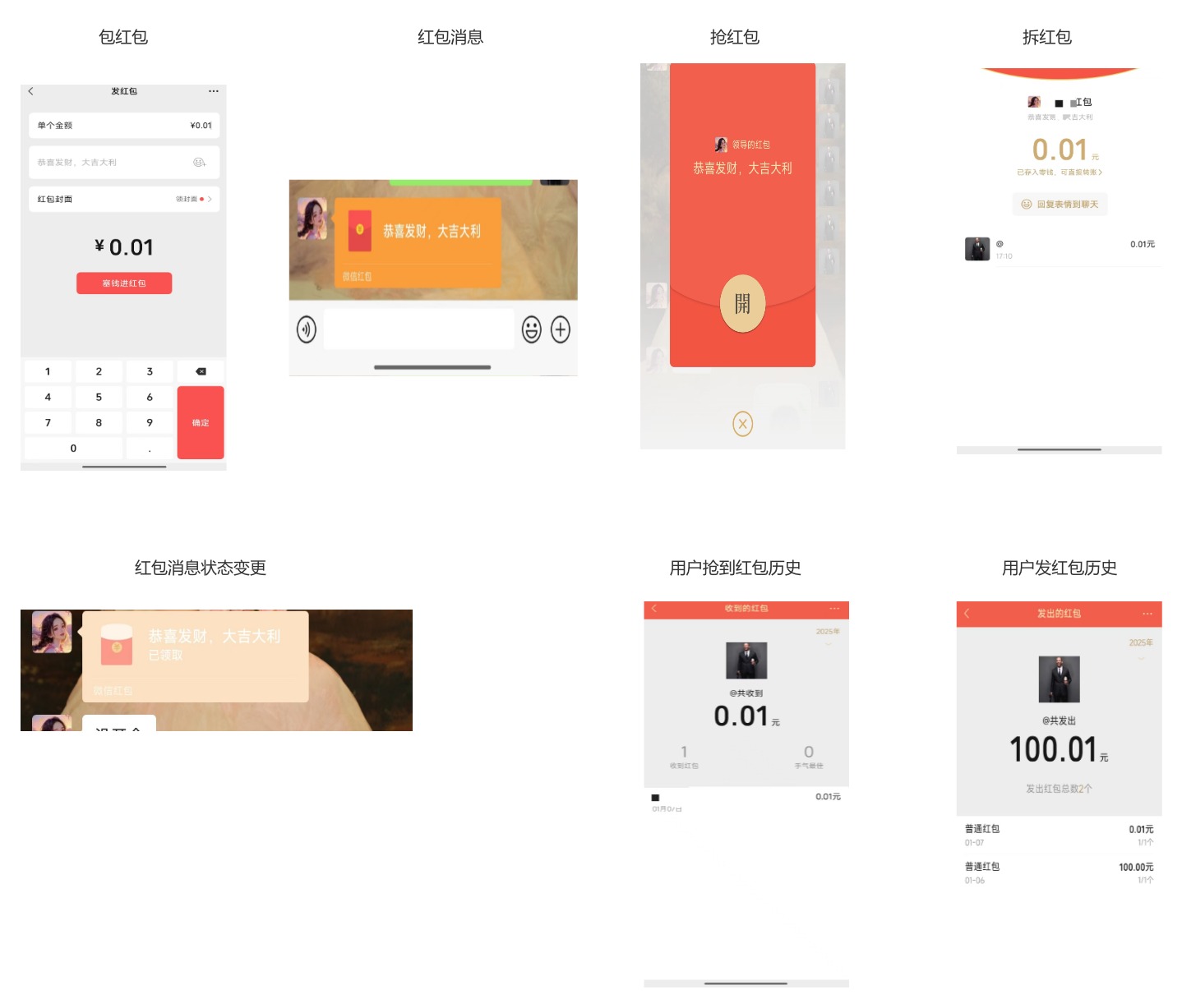 - 包红包:设置红包类型、金额、人数等红包基本信息