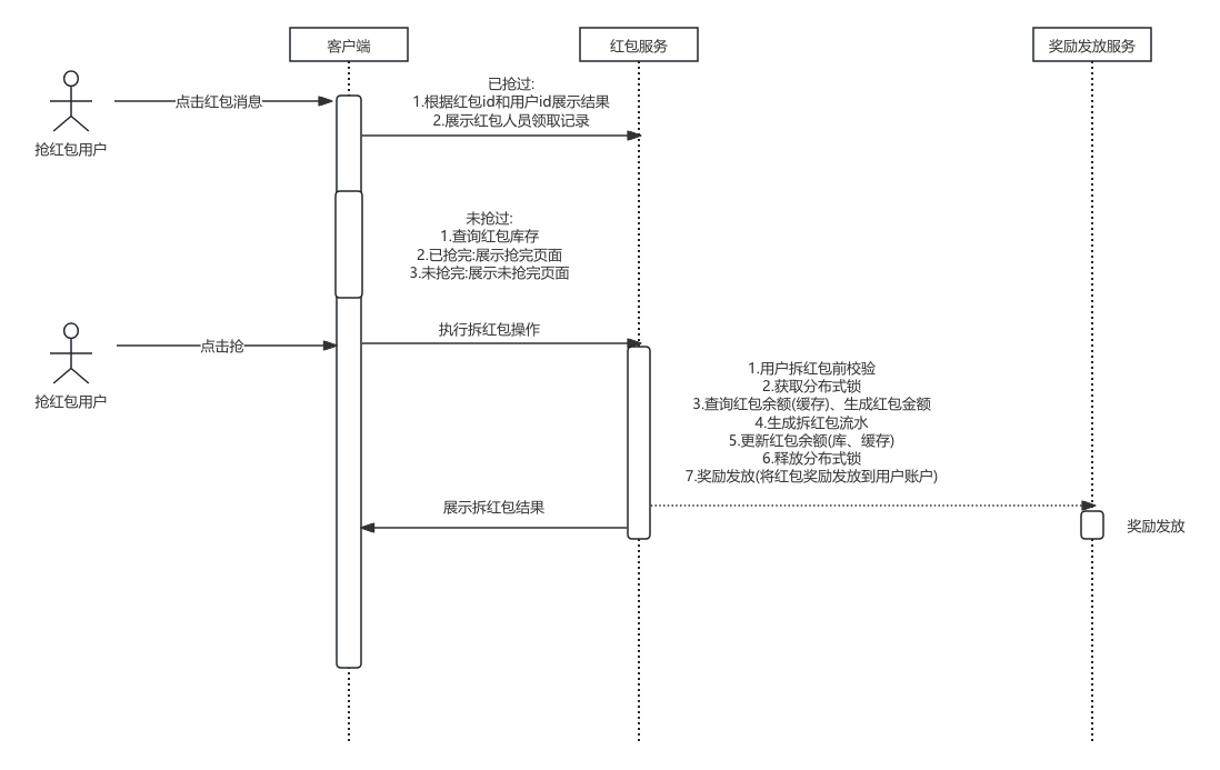- 拆红包:生成红包金额、生成拆红包记录、修改红包剩余金额、发放奖励(现金或者其它奖励)