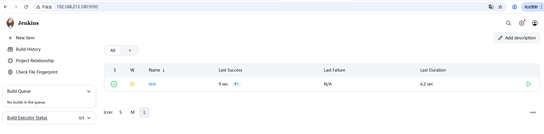 [root@localhost ~]# mkdir /var/lib/jenkins [root@localhost ~]# docker run --privileged -d -p 9090:8080 -p 50000:50000 -v /var/lib/jenkins:/var/jenkins_home -v /etc/localtime:/etc/localtime -v /usr/bin/docker:/usr/bin/docker -v /var/run/docker.sock://var/run/docker.sock -u root --restart=always --name=jenkins jenkins/jenkins