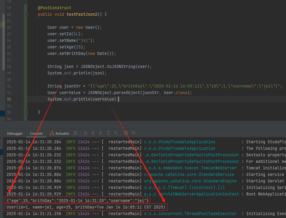 String jsonStr = "{\"age\":25,\"brithDay\":\"2025-01-14 16:05:11\",\"id\":1,\"username\":\"jei\"}";