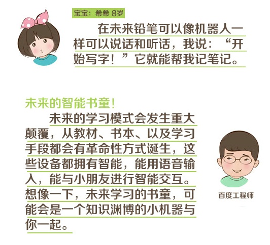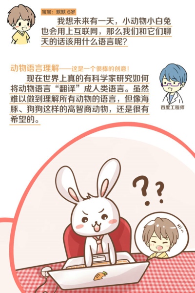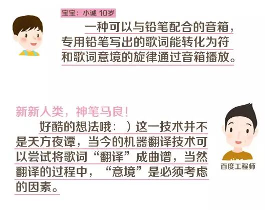 不过您别说,3万个小朋友提的这些“幻想”中,俺还真觉得有很多能给百度带来很大启发啊:例如让人类能 和小鸟对话那个——不就是兽语识别吗?这个最符合百度大数据的技术特征:翻译动物的语言……将来可以人兽对话,然后说不定我们不仅能够知道很多大自然的奥 秘,还能知道很多人类之间的秘密……