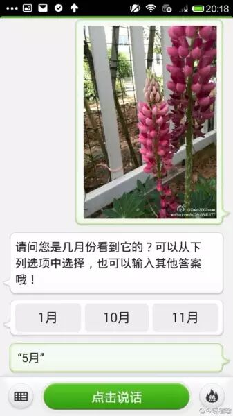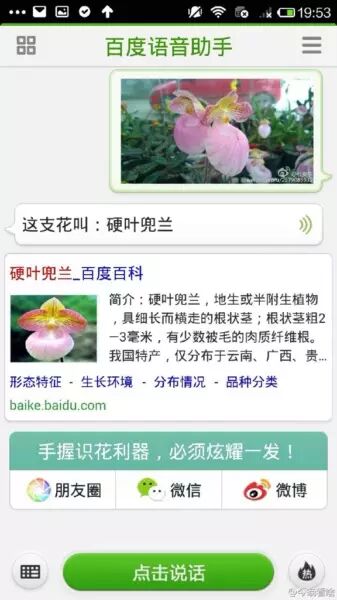 据说现在百度的花卉的库是最大最全的……所以现在才先推这个。不过,问花的话,光是语音可不行,还得拍张照片去考考百度。