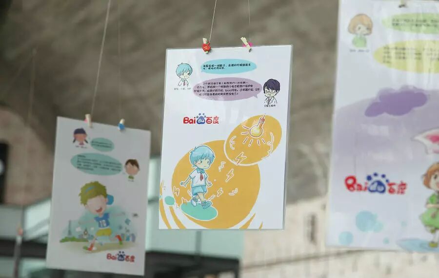 这旁边摆了个二维码——是百度手机语音助手的二维码。而会场上空又悬挂着很多孩子和百度工程师的对话。