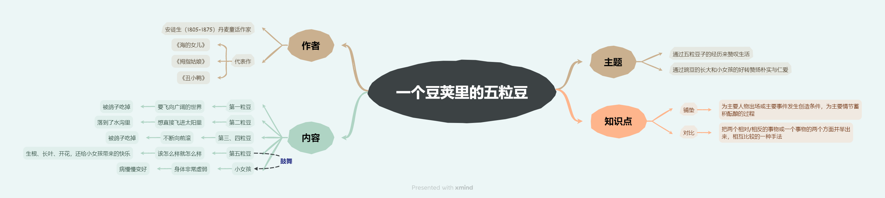 从作者、内容、主题、知识点着手,概述了“一个豆荚里的五粒豆”的大致内容和重点。以一个豆荚里的五粒豆作为主题,以作者、内容、主题、知识点作为分支,再衍生子主题进行扩展
