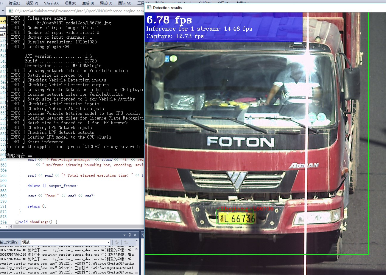 参数:-i E:/OpenVINO_modelZoo/LD1930.jpg -m E:/OpenVINO_modelZoo/vehicle-license-plate-detection-barrier-0106.xml -m_va E:/OpenVINO_modelZoo/vehicle-attributes-recognition-barrier-0039.xml -m_lpr E:/OpenVINO_modelZoo/license-plate-recognition-barrier-0001.xml