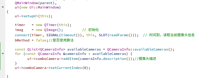 这个程序最为重要的地方,就是实现了摄像头设备的枚举(当然QT官方的例子可能也实现了,但是不是非常明显);在图像采集这块,同样采用的是QCamera。这段代码还有