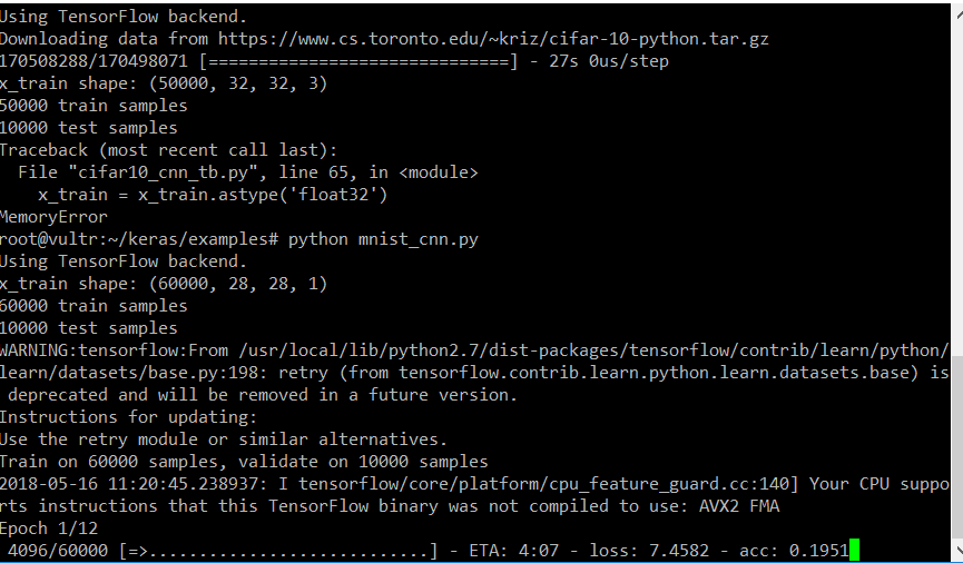 很遗憾,在1024mb的vps上面,cifar_10跑不起来,最后还是选择跑mnist