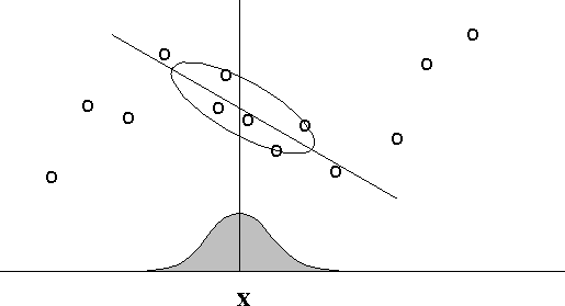 用任何一条直线来模拟这个数据集都是不行的,因为这个数据集看起来不像是一条直线。但是每个局部范围内的数据点,可以认为在一条直线上。每次来了一个位置样本x,我们在X轴上以该数据样本为中心,左右各找几个点,把这几个样本点进行线性回归,算出一条局部的直线,然后把位置样本x代入这条直线,就算出了对应的y,完成了一次线性回归。