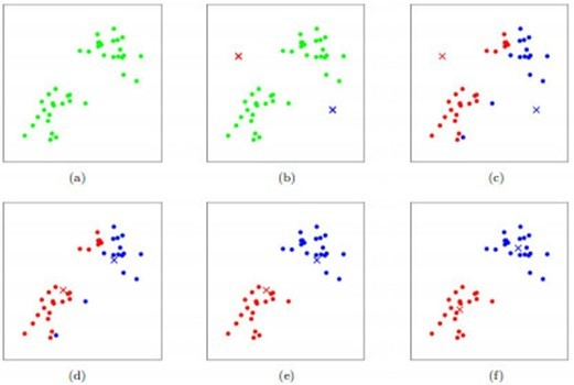 如图所示,数据样本用圆点表示,每个簇的中心点用叉叉表示。(a)刚开始时是原始数据,杂乱无章,没有label,看起来都一样,都是绿色的。(b)假设数据集可以分为两类,令K=2,随机在坐标上选两个点,作为两个类的中心点。(c-f)演示了聚类的两种迭代。先划分,把每个数据样本划分到最近的中心点那一簇;划分完后,更新每个簇的中心,即把该簇的所有数据点的坐标加起来去平均值。这样不断进行”划分—更新—划分—更新”,直到每个簇的中心不在移动为止。(图文来自Andrew ng的机器学习公开课)。