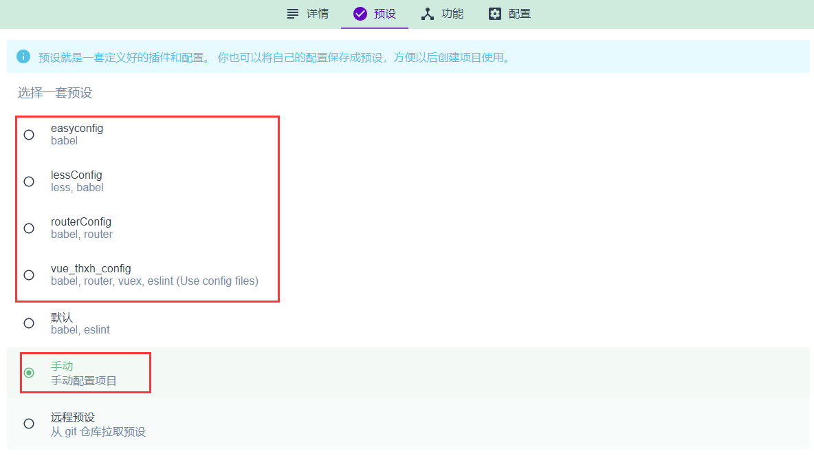 3)预设项目的一些配置,此时可以选择之前的预设配置,也可以手动配置。本次选择“手动”,点击“下一步”: