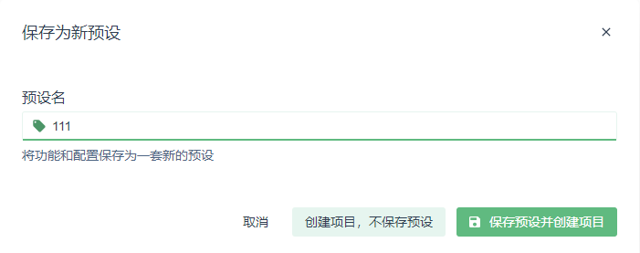 4)手动配置项目,设置预设名称,点击“保存预设并创建项目”,等待一段时间等待项目创建完成: