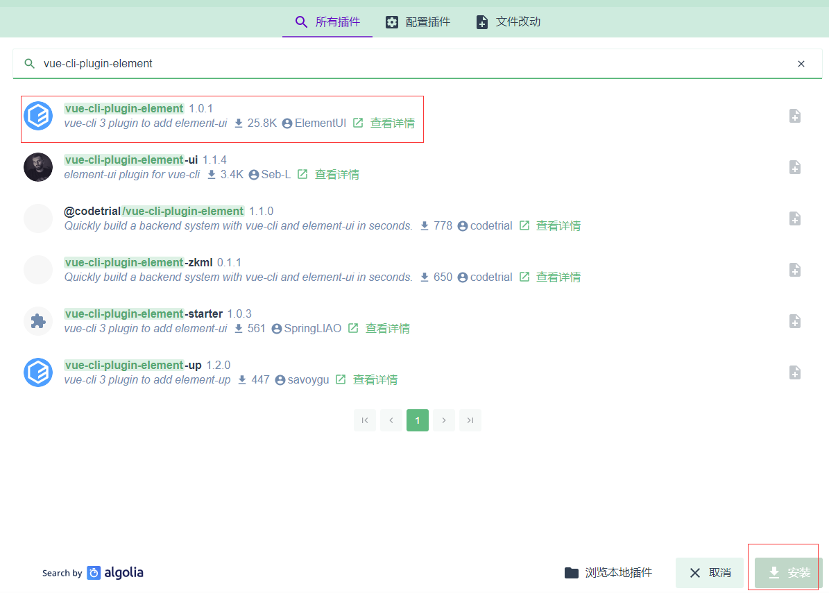 选择刚创建的项目,选择“插件”,选择“添加插件”, 搜索“vue-cli-plugin-element”,选择要安装的插件,点击“安装”: