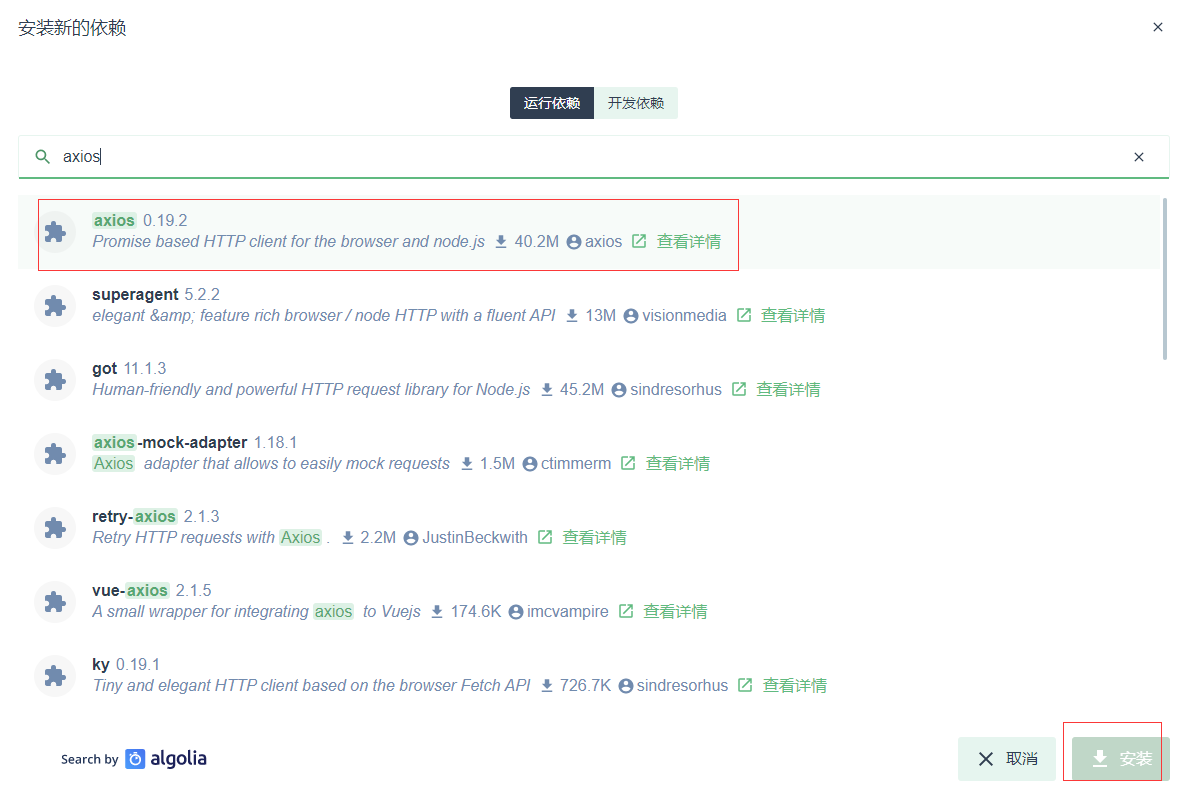 选择“依赖”,选择“安装依赖”,搜索“axios”,选择后点击“安装”(注意要安装到运行依赖)。