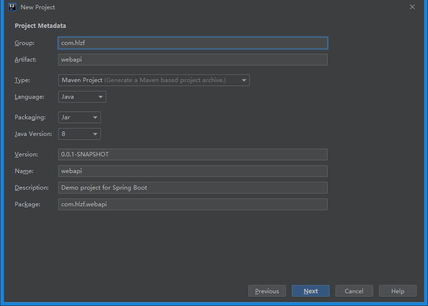 <groupId>com.hlzf.webapi</groupId> <artifactId>hlzfWebApi</artifactId> <version>1.0.1</version> <name>hlzfWebApi</name> <packaging>jar</packaging> <description>hlzfWebApi</description>