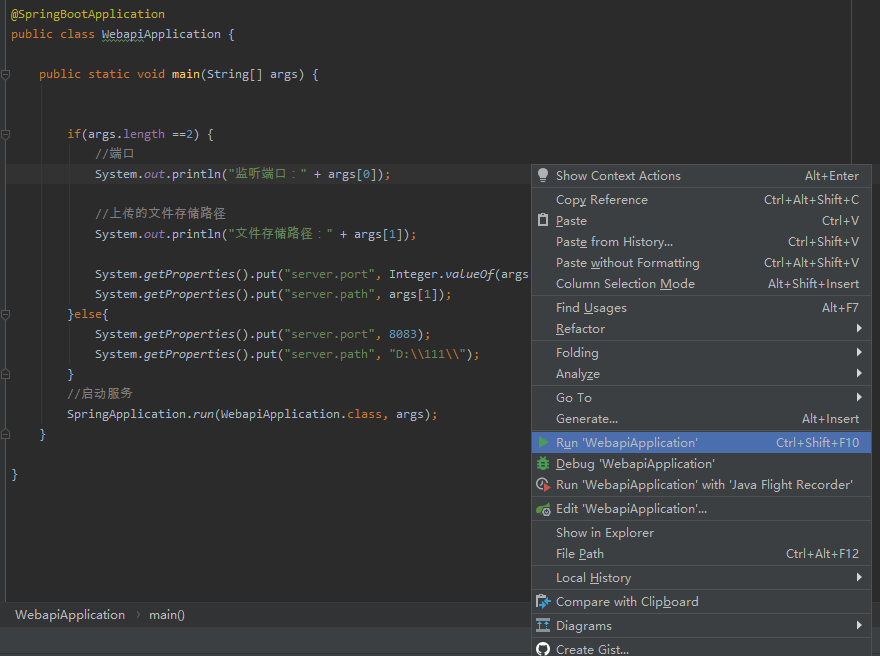 @SpringBootApplication public class WebapiApplication { public static void main(String[] args) { if(args.length ==2) { //端口 System.out.println("监听端口:" + args[0]); //上传的文件存储路径 System.out.println("文件存储路径:" + args[1]); System.getProperties().put("server.port", Integer.valueOf(args[0])); System.getProperties().put("server.path", args[1]); } //启动服务 SpringApplication.run(WebapiApplication.class, args); } }