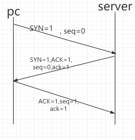 第二次握手:服务器收到请求报文,同意建立连接,向PC端发送确认,讲SYN和ACK均设置为1,ack=x+1,且随机生成一个初始序号seq=y。