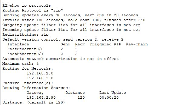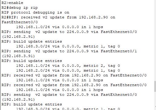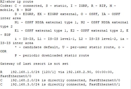 R 192.168.1.0/24 [120/1] via 192.168.2.90, 00:00:00, FastEthernet0/0:192.168.1.0/24是目标网络,[120/1]是管理距离及跳数,192.168.2.90是下一跳的IP地址,00:00:00是等待更新的时间.