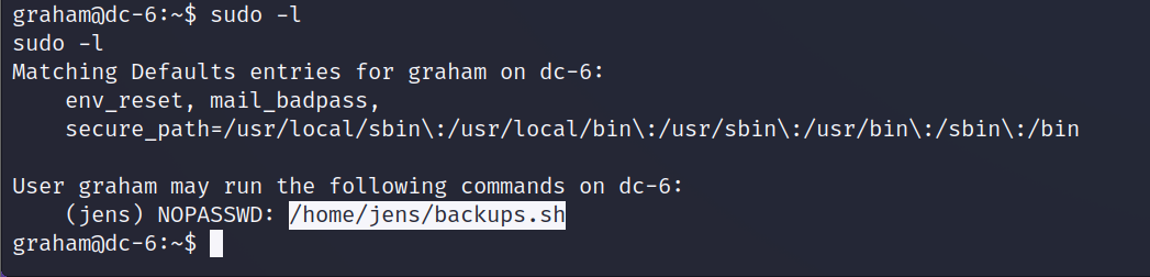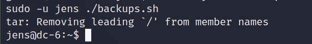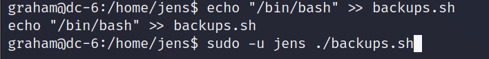 发现jens可以执行backups.sh,我们可以往backups.sh添加命令,直接打开/bin/sh,从而跳过密码切换到jens用户