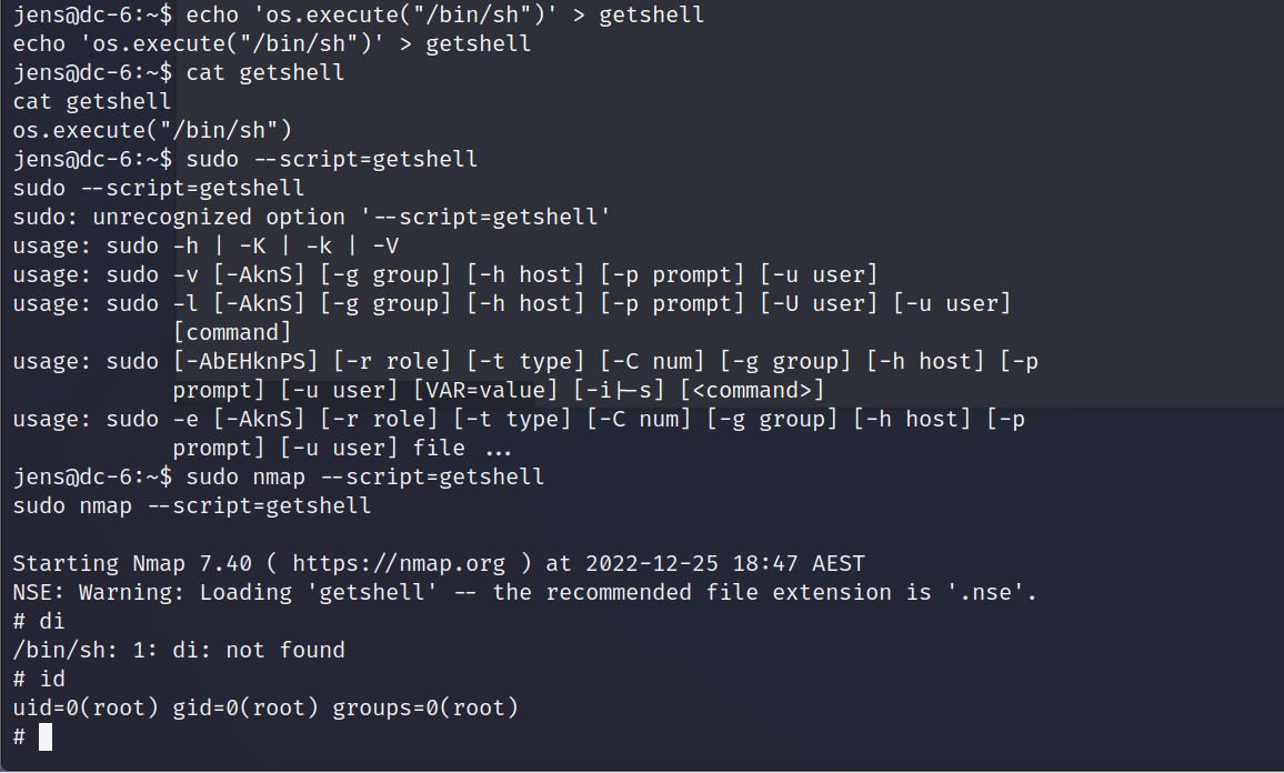 创建一个 getshell 的文件,并且写入 os.execute("/bin/bash"),–script指定nmap运行脚本