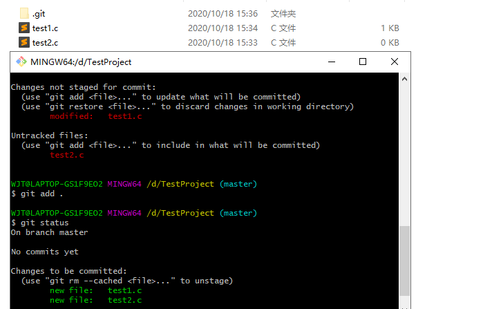 ②修改 test1.c 的内容并新建一个 test2.c 文件,使用 git add . 将这两个文件添加到暂存区(index)