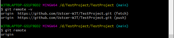 ②使用git remote -v 可以查看更详细的远程存储库信息,包括fetch(抓取)的远程存储库URL和push(推送)的远程存储库URL。直接输入git remote可以看到git clone之后默认的远程存储库名称为orgin。
