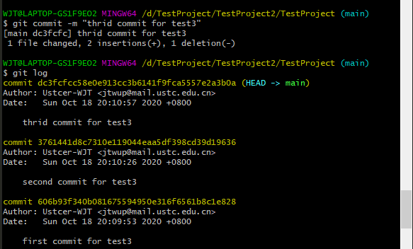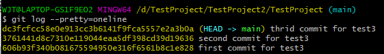①对 test3.c 进行三次修改并分别提交到暂存区,用git log或者git log --pretty=oneline 命令查看提交记录