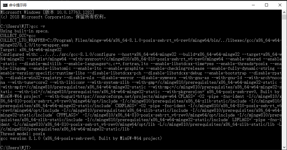 ②在开始菜单上单击右键,选择“命令提示符”进入命令窗口。输入“gcc -v”查看是否安装成功,若成功显示“gcc version”则表示配置成功。